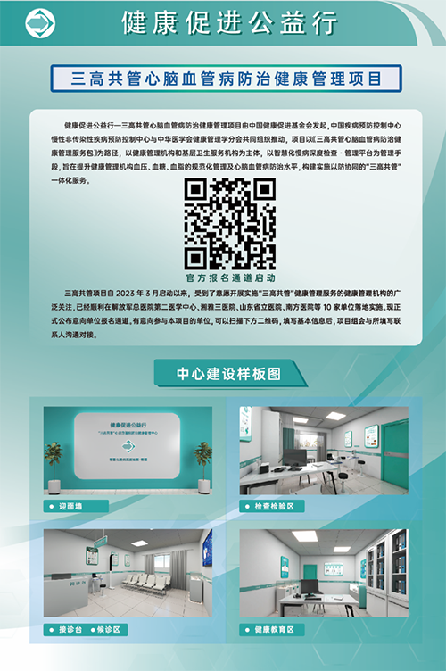 三高共管心脑血管病防治健康管理项目由中国健康促进基金会发起,中国疾病预防控制中心慢性非传染性疾病预防控制中心与中华医学会健康管理学分会共同组织推动,项目以《三高共管心脑血管病防治健康管理服务包》为路径,以健康管理机构和基层卫生服务机构为主体,以智慧化慢病深度检查·管理平台为管理手段,旨在提升健康管理机构血压、血糖、血脂的规范化管理及心脑血管病防治水平,构建实施以防协同的“三高共管一体化服务。